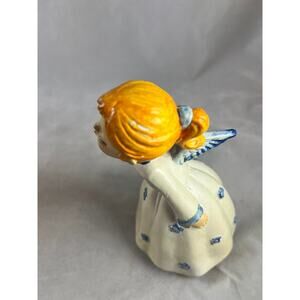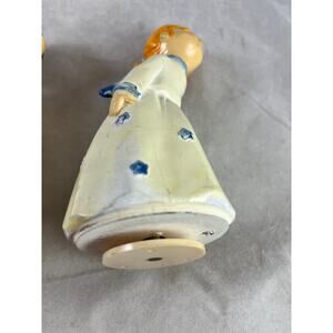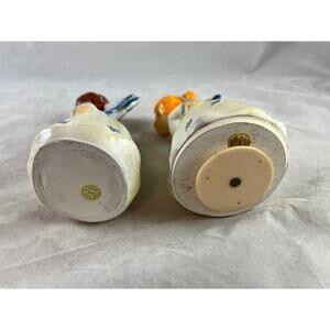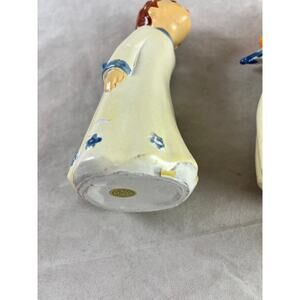 Pair of vintage Japan kissing angels. They are handmade of a hard, painted paper mache material. They are both approx. 5 5/8" in height. The girl is mounted atop a rotating music box. The music box still works, but not as well as when new. Unknown tune. The boy has some paint rubs in his hair and a few around the base. The girl also has some small paint rubs in her hair and some chips in the paint along the edge of her skirt, at the base, as shown.