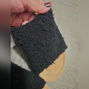 Comfortable slide sandals with a fuzzy black upper. Perfect for casual wear.