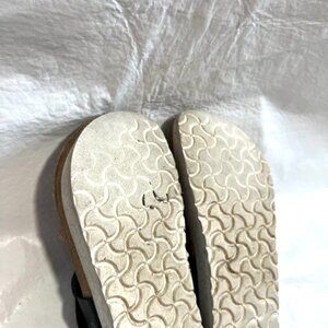 Papillio Birkenstock Gizeh platform sandals, black birko flor, t strap / thong, suede footbed, crackled white sides, EU 39 / US women's 8 - 8.5 regular/wide width, preowned and shows a lot of wear on the soles, discoloration, flaws and fraying on the cork - see photos