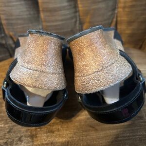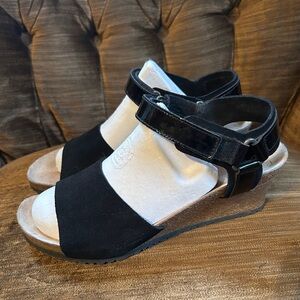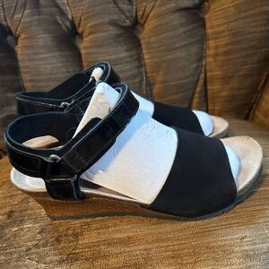 Papillio by Birkenstock Eve wedge sandals. Size 9/9.5. Adjustable velcro strap. Black velvety fabric. Only worn about three times, great condition. Very comfortable.