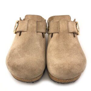 Contoured cushion footbed creates custom support with wear. Classic suede upper. Suede footbed lining helps keep you comfortable. 2" wedge heel with lightweight PU sole. One strap with rounded gold tone metal pin buckle.
