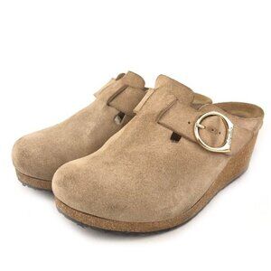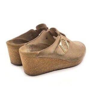 Contoured cushion footbed creates custom support with wear. Classic suede upper. Suede footbed lining helps keep you comfortable. 2" wedge heel with lightweight PU sole. One strap with rounded gold tone metal pin buckle.
