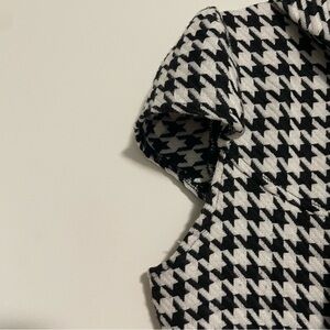 This is ladies Papillon mid length dress. It has a fun cowl neck style collar, 2 buttons mid chest and little capped sleeves. The back has a button with a keyhole closure. The dress is black and white, houndstooth print. It is 100% acrylic. There is very minor pilling under the arms but it could be easily shaved off. The dress is a size large and also has a side zipper.