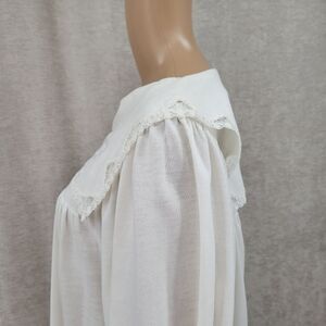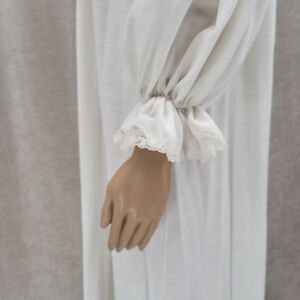 White Nightgown with bib/ sailor style collar with crochet lace trim and purple butterfly embroidered on collar. Long sleeves with elasticated cuffs with lace trim. Lace trim on bottom hemline.