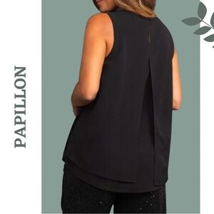 Elevate your holiday style with the Papillon Sleeveless Sequin Blouse! This chic blouse, crafted from layered black crinkle fabric, features a shimmering sequin front panel for an extra dose of glam. The sleeveless cut, round neckline with a back keyhole, and split back detail make it effortlessly elegant, while the curved hem ensures a flattering fit.