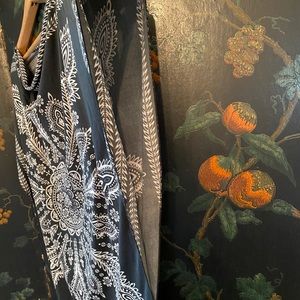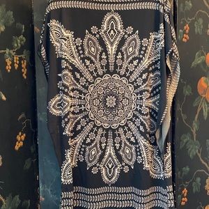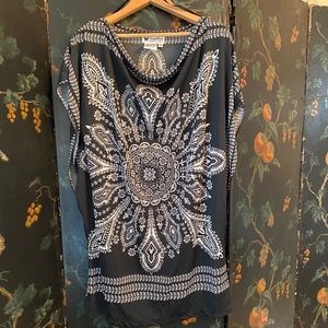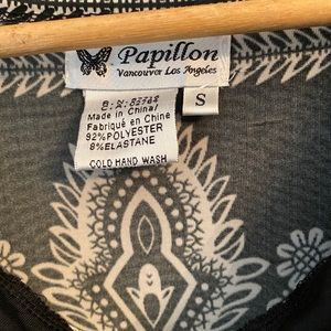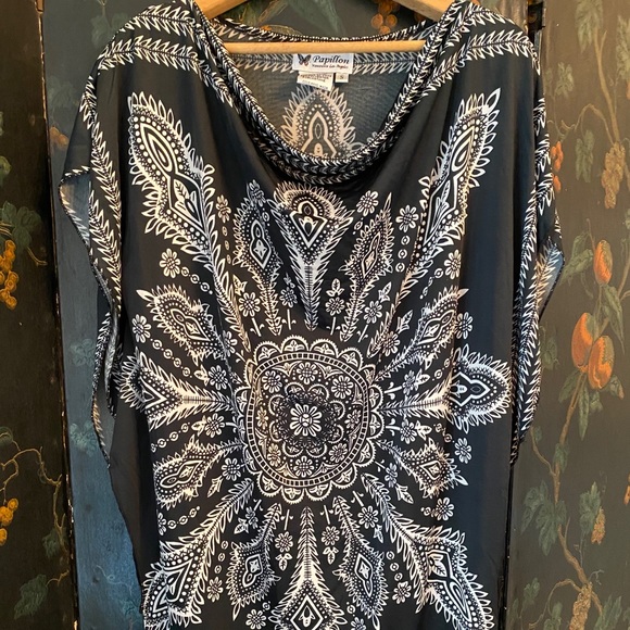 Papillon polyester tunic with wide arm openings. Drapes beautifully and looks stunning over black leggings. Size small.