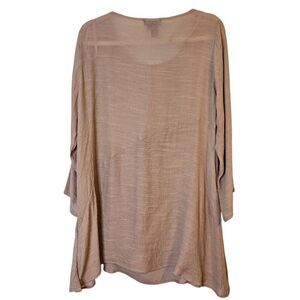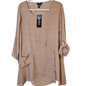 Armpit to armpit is 22 inches and the length is 32.5 inches. 1 pocket, rounded neck, flowy, long sleeved with tabs to roll them up, viscose/polyester. NWT. Open to reasonable offers.
