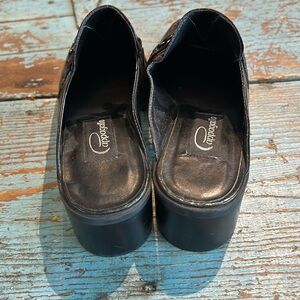 Step into timeless sophistication with these Pappagallo croc-embossed mules. Crafted from genuine leather with a rich brown and black two-tone finish, these shoes feature a chunky block heel and silver-toned horsebit detail across the vamp. Perfect for pairing with jeans, skirts, or tailored trousers for a polished retro-inspired look.
