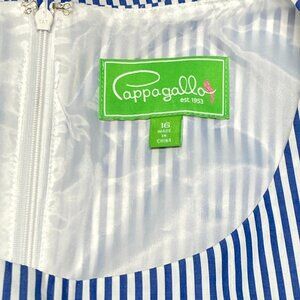 Vintage Sleeveless Scoop Neck Fit and Flare Classic Stripe Dress from Pappagallo. Lovingly worn – looks in excellent condition. Fit and flare silhouette in semi sheer blue and white stripes. Princess seams on bodice. Box pleats at waistline add more movement and structure to skirt. Fully lined in shimmery white. Scoop neckline front and higher in back. Seam at natural waist with self tie belt. Full swingy skirt with stripes forming diagonals at sides. Lining about 1” shorter than skirt. Invisible zipper in back. Hits mid shin. Perfect for brunch, casual weddings, or summer parties, this dress gives off a nautical, preppy vibe that never goes out of style.