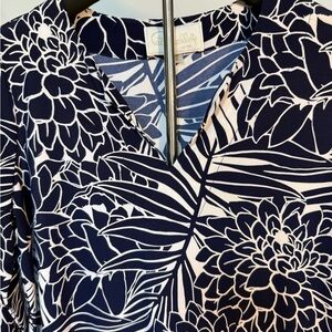 Chic and comfortable Pappagallo tunic top in a bold navy and white floral print. Features a flattering split V-neckline, 3/4 sleeves, and side slits for ease of movement. Perfect for casual wear, vacation, or layering.