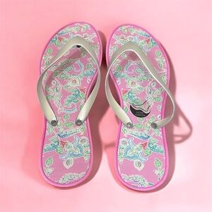 Chic pink sandals with silver straps. Features a vibrant paisley design and and "EXTRA CUSHION" Ideal for casual wear. NWOT Originally $79.