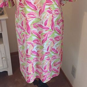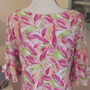 Vibrant floral garment by Pappagallo. Features a mix of pink, green, and cream colors. Shift shape. Boatneck. Pullover. Raglan, ruffled bell sleeves. Size M measures 40 at chest, 38 at waist, and 44 at hips. 38 long from shoulder to hem. Iconic summer colors. Don't be shy.