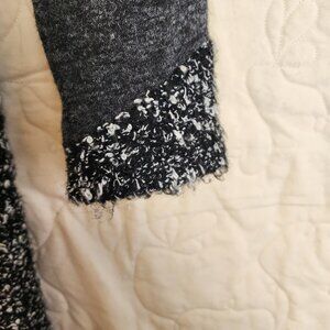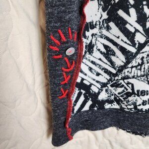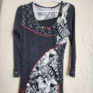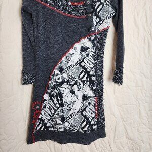 This dress is in great shape. It is made from Acrylic, Polyester and Spandex. A modern mixed media design with a message. There are really nice accents with the red stitching and buttons. The dress is a size small and needs to be hand washed.