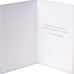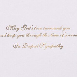 Help bring comfort to those experiencing the loss of a loved one with this premium sympathy card from Papyrus. Thoughtfully and beautifully crafted, the layered-paper cross is adorned with white flowers, and metallic gold foil, soft glitter, and premium paper stock bring class and grace. The card honors the seriousness of this time in their life, and the meaningful message inside will remind them they are surrounded by God’s love and that you’re thinking of them