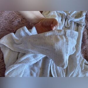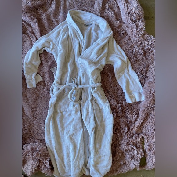 Soft waffle knit robe in a warm cream color. Shawl collar and attached waist tie. Deep front pockets and long sleeves. Lightweight and comfy for lounging.