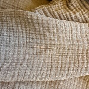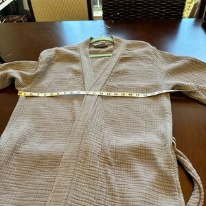 Soft taupe robe with textured fabric. Ideal for comfort and style. This robe has quite a few small flaws that don’t impact wearability, shown closeups of overall condition including tiny bleach spot. Price reflects condition.