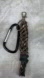 This handmade paracord braided keychain with a black carabiner and key ring in green features a camouflage pattern and a swivel lobster clasp accent. Made in the United States, it includes genuine leather cord and is designed for men with a masculine, hunting, outdoors theme. The multicolor keychain is a unique and practical accessory.