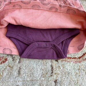 Parade Organics 🌱 bodysuit dress with layered long sleeves. Ruffle shoulders and snap collar. Coral circles print. Size 3-6 months.