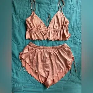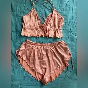 Stylish peach/pink PJ set with ruffled details. Includes a top and bottom. Front is reversible with a tie option and adjustable straps. Bottoms are short and have adjustable sides.