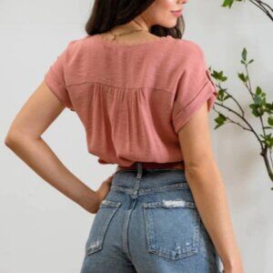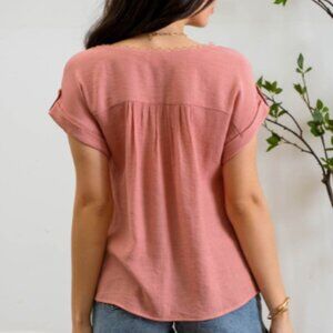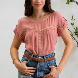 Add a touch of whimsy to your wardrobe with our "Paradise Dusty Apricot" lace top! Featuring round neck and classic lace trim, plus a button tab sleeve and short sleeve, you'll feel like you're in a floral-filled wonderland. (Oh yeah!) So, bring on the romance!