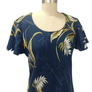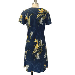 Paradise Found Hawaiian Print Dress Size L Short Sleeve Blue Vintage Rayon Shift
