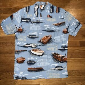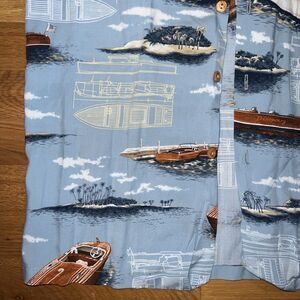 Paradise Found Hawaiian Shirt Large Blue Classic Boats Island Beach Tiki Rayon