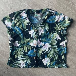 This Orchid Ginger v-neck top features white hibiscus and ginger flowers on an enchanting black background. It is made of quality soft 100% rayon and comes with real wood buttons.