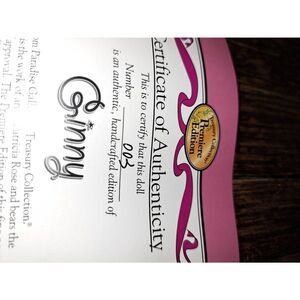 Good vintage condition Paradise Galleries “Ginny” porcelain doll by Patricia Rose, part of the Country Girl Collection, Premier Edition in the Treasury Collection. Authentic, handcrafted, limited edition. Features an 18-note musical movement that plays Skip to My Lou. The doll measures approximately 16–16.5 inches tall and comes with original base, certificate of authenticity, and all original packaging. Jenny is dressed in a red-and-white checkered dress with white lace and blue trim, complete with adorable cowboy boots and a playful square-dancing pose. Never displayed outside of the box. Box shows minor wear. Beautiful collectible for display or gift.