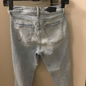 Size 26 Paradise Mine jeans (from Aritzia). I've only worn them once they're just way too small for me now. Distressed in the knees!