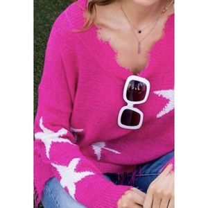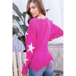 Dazzle into the season in this gorgeous paradise pink starred sweater. A modern twist to a classic design, this light weight sweater features unique hemming frayed at the neck and sleeves. Pair with your favorite leggings or jeans with a pair of boots for an instant on trend look.