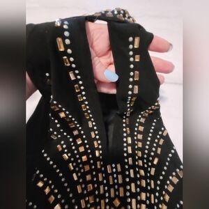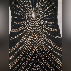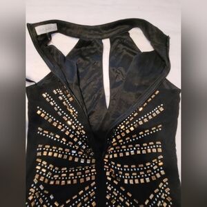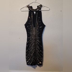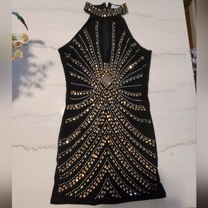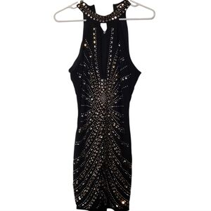 Paradiso Black and Gold Rhinestone Gem Embellished Mini Halter Dress Size Large