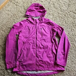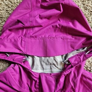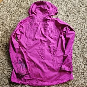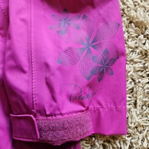 Stylish pink rain jacket by Paradox. Features a hood and multiple pockets. Perfect for casual wear.