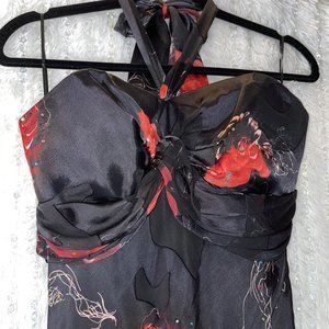 Paraf Sweetheart Halter Maxi Dress Size 12 (42EU) Black Red Floral Satin Jewels