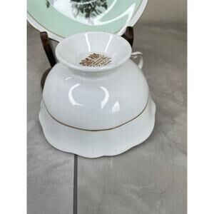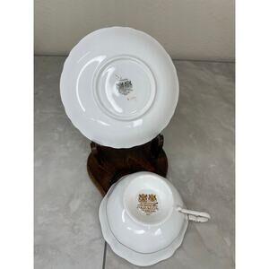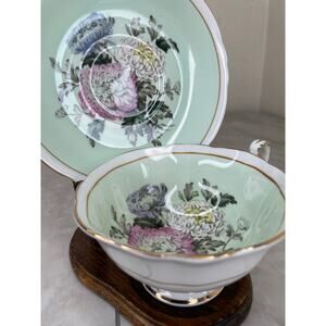 This Paragon Double Warrant teacup and saucer set is a beautiful addition to any collection! Featuring delicate Chrysanthemum and Mums floral pattern on a soothing mint green background.