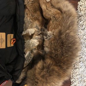 Very warm with real rabbit all throughout inside of hood. This is a slim fitting coat in size S. This is a true S Worn only half a season and unfortunately no longer fits!
