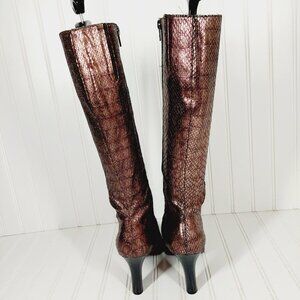 Parallel Brown Metallic Reptilian Print Side Zip Elastic Calf Heeled Boots H476