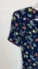 This fit and flare dress is divine. It is dark navy blue with whimsical flowers scattered all over. It is button front (entire length) with pretty clear cut-glass buttons that you would never find nowadays. There are snaps in place between some of the buttons, too, to help prevent gaps. Simple v neckline and short sleeves. Adorable pouch pockets on front of dress have knotted tie closures. Princess seaming adds to the overall figure-flattering style of this dress. Skirt is very full with lots of swing and movement. Lightweight fabric lets it float around your hips and legs. Made in USA.