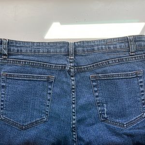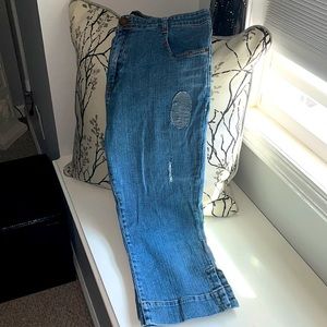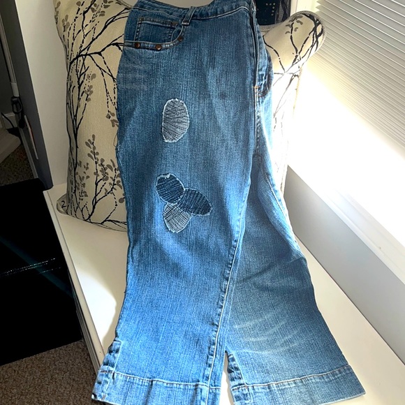 Parallel blue Jean capris with decorative patchwork design. In great gently loved condition.