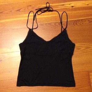 Black tank top with meshy lace trim. Adjustable straps with tie around back of neck.