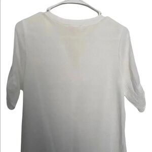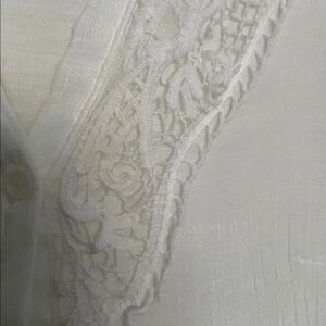 White crepe style fabric, gorgeous lace accent around neck line, light weight, perfect for layering.