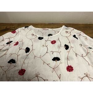The Parami Design Floral Embroidered Blouse is a stylish and comfortable peasant top in a white color. This 3/4 sleeve blouse features a round neckline and a relaxed fit, perfect for a cottage or bohemian look. Made of lightweight and breathable polyester material, this blouse is adorned with beautiful floral embroidery accents, adding a charming touch to the overall design. Ideal for women who wear plus sizes, this blouse is a versatile and fashionable addition to any wardrobe.pre good condition we ship fast measurements are in the pictures