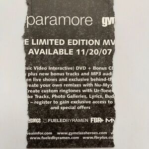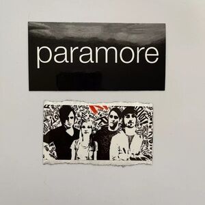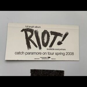 Two unused Paramore stickers from 2007 to promote Paramore's album, "Riot!" and the 2008 tour. One is a standalone sticker, and the other I ripped out of a magazine. The sticker is intact with the ripped edges being the card stock paper.