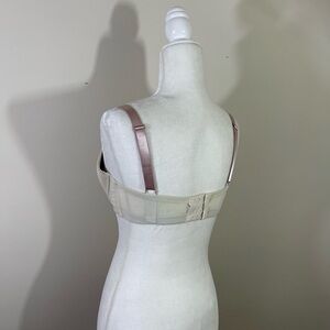 Very pretty bra. Made with an elevated fabric and trim. The padding is a. little more pronounced. There is a stretch to the straps. The straps also continue down to the inside bottom edge of the bra back. No visible flaws. Any questions please ask. Will answer questions as soon as possible. K
