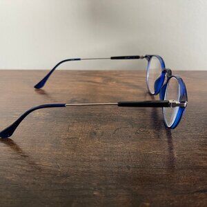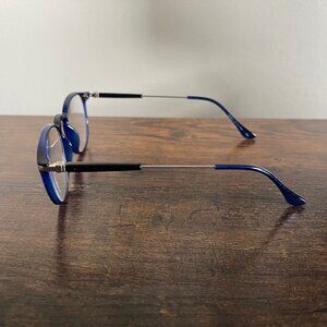 Upgrade your eyewear style with these Parana Optics Blue Round Frames, featuring a bold translucent blue plastic front and sleek silver metal arms. These eyeglass frames offer a modern, lightweight look perfect for everyday wear. The stylish round shape complements a variety of face shapes and adds a pop of color with its vivid blue tone. Ideal for optical lenses or as fashion eyewear. These Parana Optics blue round eyeglass frames are in very good pre-owned condition with minimal surface wear from gentle use. The frame structure is solid, hinges open and close smoothly, and the arms are straight. A great-looking pair of lightweight fashion eyeglass frames ready for everyday wear.