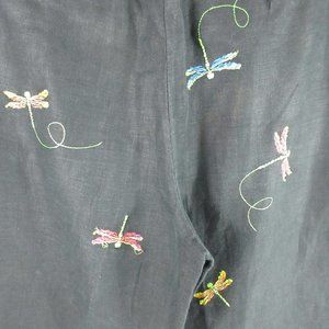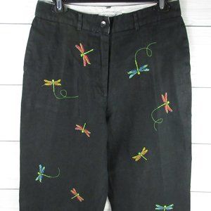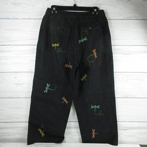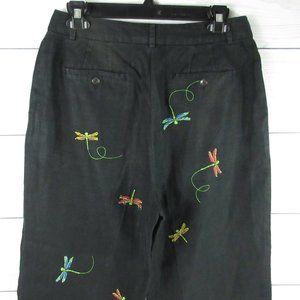 Paraphrase Pants Women 10 Black Linen Embroidered Colorful Dragonflies High Rise