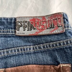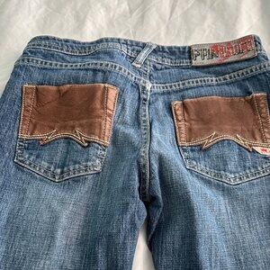 Chic dark blue jeans with unique stitching. Boot cut style for a flattering fit. Perfect for casual wear.