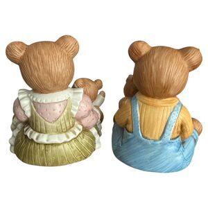 Set of 2 Parent & Child Teddy Bear Figurines Sweet vintage ceramic bears dressed in pastel clothing. One features a mother bear holding her cub in blue overalls, the other a father bear holding his cub in a pink dress. Both are marked "1444" on the base.