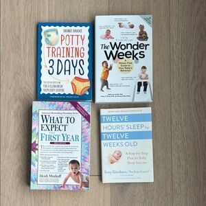 Set of four parenting books. Includes guides on potty training, baby development, and sleep strategies. Perfect for new parents.