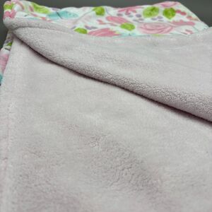 Parents Choice baby blanket featuring a pink floral and butterfly pattern on one side and solid pale pink fleece on the reverse. Made of soft polyester fleece, lightweight and cozy. Originally 30x40 inches, now measures approximately 29x37 after wash. Light matting from wash and use, and tag has been removed. Otherwise good clean condition, no odors, and freshly washed.