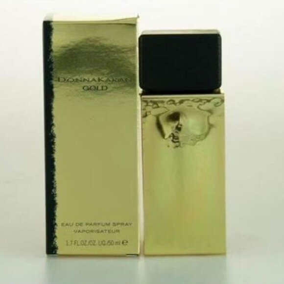 Elegant and sophisticated fragrance Donna Karan Gold Eau de Parfum perfume bottle with black cap. Luxurious gold packaging with a sleek black cap. Features an amber liquid inside with white clove, casablanca lily, acacia, gold pollen, templar, amber, patchouli, balsams scent.